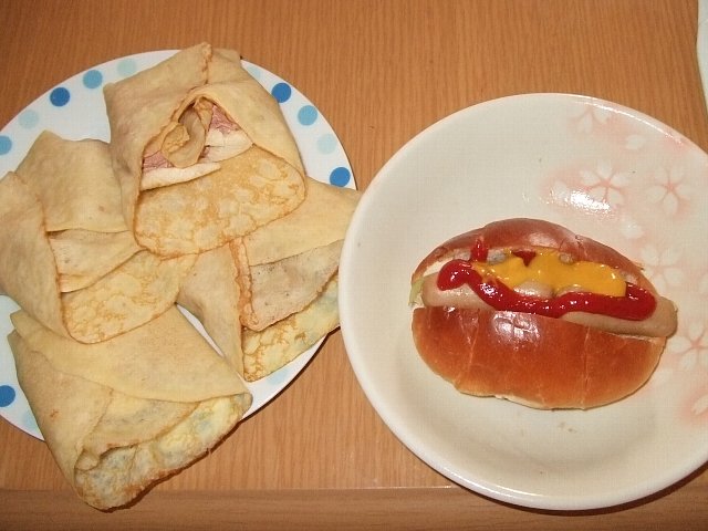 昼ご飯はロールパンで作ったホットドックと、