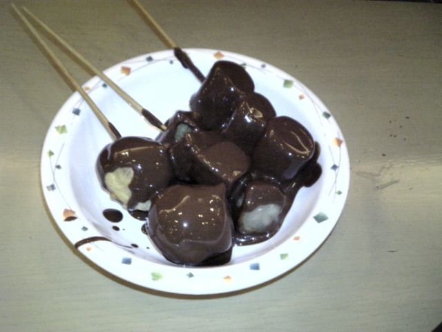串に刺して、チョコの噴水から